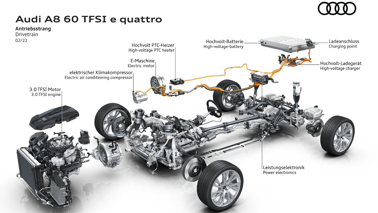 Το 4κίνητο plug-in υβριδικό Audi A8 φέρει τον τρίλιτρο υπετροφοδοτούμενο TFSI κινητήρα των Γερμανών, τον οποίο και συνδυάζει με με έναν ηλεκτρικό κινητήρα που βρίσκεται στον πίσω άξονα και μια μπαταρία ιόντων-λιθίου με συνολική ενεργειακή χωρητικότητα 17,9 kWh, εκ των οποίων τα 14,4 kWh είναι “καθαρά”.