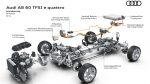 Η συνδυαστική ισχύς του συστήματος, που προσφέρει και δυνατότητα κίνησης αμιγώς ηλεκτρικά, φτάνει στους 462 ίππους και τα 700 Nm ροπής, με τα 0-100 χλμ./ώρα να επιτυγχάνονται σε 4,9 δευτερόλεπτα και την τελική να περιορίζεται ηλεκτρονικά στα 250 χλμ./ώρα. Η Audi δεν ανακοινώνει προς το παρόν την ηλεκτρική αυτονομία της plug-in υβριδικής ναυαρχίδας της που μπορεί να αναπτύξει ταχύτητα μόνο με τη χρήση του ηλεκτρικού μοτέρ έως και τα 135 χλμ./ώρα.
