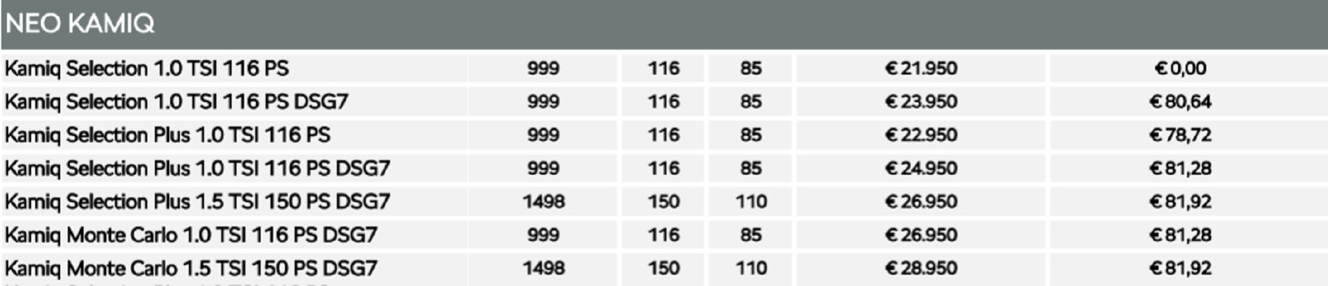 Μία ακόμα αλλαγή στη γκάμα του Skoda Kamiq αποτελεί η έκδοση Monte Carlo, η οποία πλέον επανέρχεται και στην έκδοση 1.0 TSI 116 PS DSG, ενισχύοντας περαιτέρω τις διαθέσιμες επιλογές για το κοινό. Στον παρακάτω πίνακα μπορείτε να δείτε αναλυτικά τις τιμές του Skoda Kamiq σε όλες τις διαθέσιμες εκδόσεις. Οι τέσσερις στήλες προβάλλουν κυβισμό, ισχύ, εκπομπές ρύπων, τιμές και τέλη κυκλοφορίας.