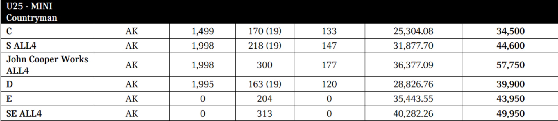 Στον πίνακα που ακολουθεί μπορείτε να δείτε πόσο κοστίζουν όλες οι εκδόσεις του νέου μοντέλου της βρετανικής εταιρείας. Αξιοσημείωτο είναι επίσης το γεγονός ότι το MINI Countryman προσφέρεται με 0% επιτόκιο. Μέσω του προγράμματος MINI GO 0% PLUS, η βασική έκδοση των 34.500 ευρώ προσφέρεται με μηνιαία δόση 1.449 ευρώ (διάρκεια 12 μηνών), έπειτα από προκαταβολή ύψους 17.250 ευρώ. Το παρόν πρόγραμμα προσφέρεται με εξάμηνη ασφάλιση Αllianz και εξασφαλίζει 4 χρόνια δωρεάν εργοστασιακή εγγύηση.