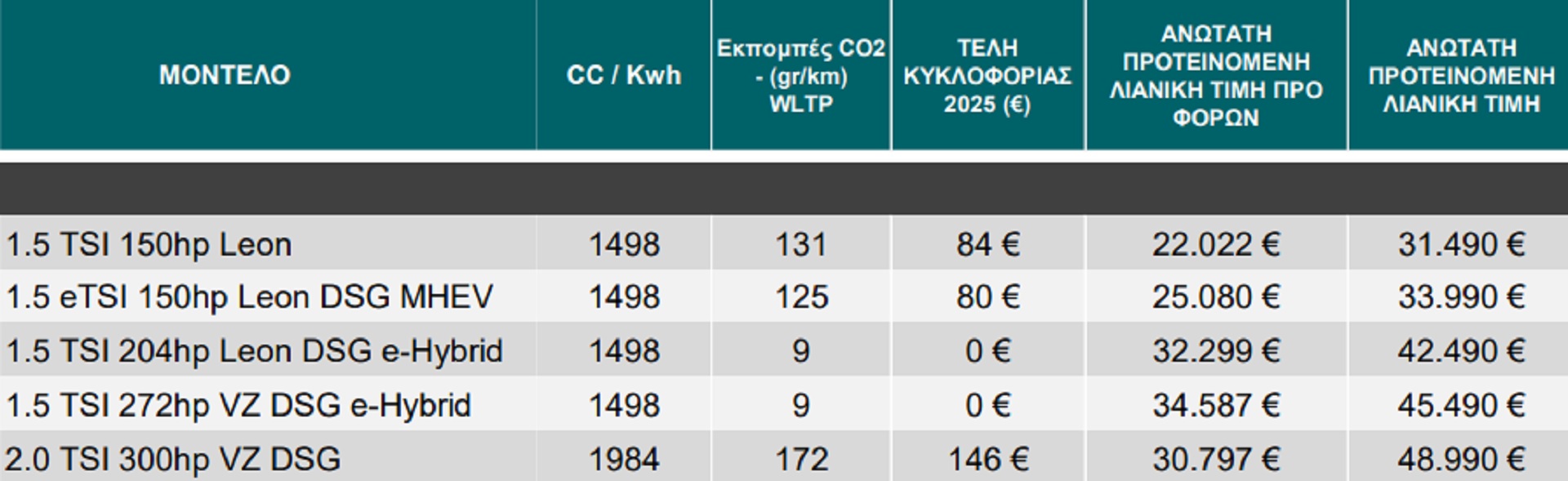 Το CUPRA Leon είναι διαθέσιμο στην Ελλάδα με κινητήρες βενζίνης, ως ήπια υβριδικό αλλά και ως plug-in ηλεκτρικό, καλύπτοντας έτσι κάθε ανάγκη. Όλοι οι κινητήρες είναι υπερτροφοδοτούμενοι με άμεσο ψεκασμό, αποδίδοντας ισχύ από 150 έως 300 ίππους. Η γκάμα ξεκινά με έναν τετρακύλινδρο κινητήρα των 1,5 λίτρων που αποδίδει 150 ίππους και συνδυάζεται με χειροκίνητο κιβώτιο 6 σχέσεων. Αυτό είναι και το πιο προσιτό CUPRA σε όλο τον τιμοκατάλογο της εταιρείας, με την τιμή να αγγίζει τα 31.490 ευρώ. Ακολουθεί η ήπια υβριδική εκδοχή του με επίσης 150 ίππους, αλλά στάνταρ αυτόματο DSG κιβώτιο και αυξημένη τιμή στα 33.990 ευρώ.