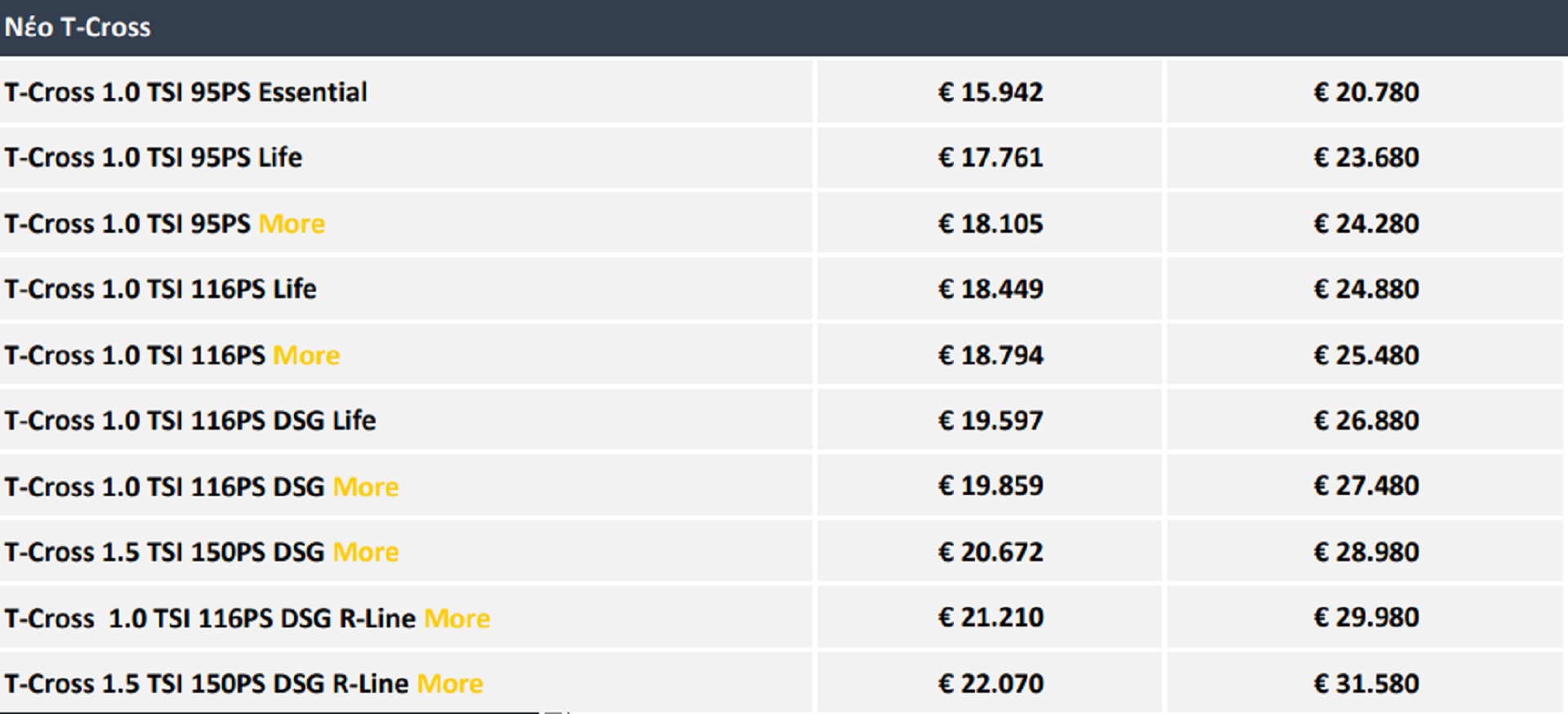 Κλείνοντας, αξίζει να αναφέρουμε ότι το VW T-Cross συνοδεύεται από 4 χρόνια εγγύηση ή 80.000 χλμ. (όποιο έρθει πρώτα). Ακολουθεί ο πίνακας όπου μπορείτε να δείτε τις τιμές του, όπως αναφέρονται στον επίσημο τιμοκατάλογο.