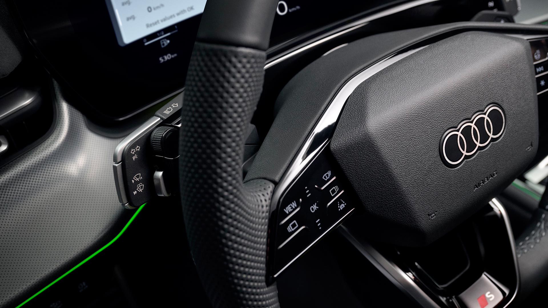 Minimal design, μέγιστη λειτουργικότητα: Το ταμπλό απλώνεται οριζόντια από άκρη σε άκρη, δημιουργώντας αίσθηση ευρυχωρίας. Η λιτή κεντρική κονσόλα εκφράζει τη φιλοσοφία «οπτικής καθαρότητας» της Audi, ενώ το σύνολο διανθίζεται με υλικά υψηλής ποιότητας, απαλές επιφάνειες και λεπτομέρειες χρωμίου. Στο κέντρο της εμπειρίας, η «ψηφιακή σκηνή» με το Audi virtual cockpit plus 11,9’’ και την οθόνη αφής MMI 12,8’’ προσφέρει απόλυτη συνδεσιμότητα, με σχεδίαση που αγκαλιάζει τον οδηγό. To head-up display προβάλλει σημαντικές πληροφορίες απευθείας στο παρμπρίζ.