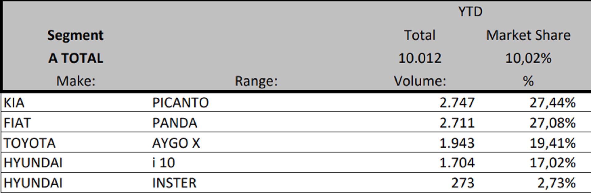 Σύμφωνα με τα στοιχεία του ΣΕΑΑ, στις δύο κατηγορίες των μικρών αυτοκινήτων (A-Segment και A-SUV), το Kia Picanto είναι το best seller με 2.747 ταξινομήσεις. Πίσω του ακολουθεί με πολύ μικρή διαφορά το FIAT Panda των 2.711 ταξινομήσεων, ενώ η τριάδα ολοκληρώνεται με το μοντέλο της Toyota. Ο λόγος για το Toyota Aygo X των 1.943 ταξινομήσεων. Στον πίνακα που ακολουθεί μπορείτε να δείτε την κατάταξη των μικρών αυτοκινήτων στην ελληνική αγορά. Ενδιαφέρον έχει το γεγονός που η 5η θέση (με μεγάλη διαφορά βέβαια από τις τέσσερις πρώτες) ανήκει σε ένα αμιγώς ηλεκτρικό μοντέλο. Πρόκειται για το νέο Hyundai Inster, του οποίου τη δοκιμή θα μπορείτε να διαβάσετε σύντομα.