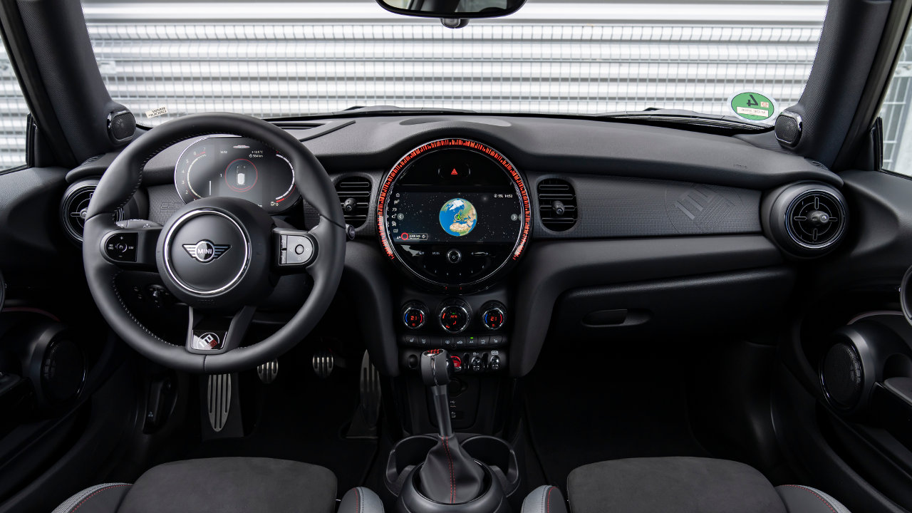 Παράλληλα, το χαρακτηριστικό κεντρικό όργανο της MINI αναδεικνύει τη σχεδίαση με το απαστράπτον κόκκινο πλαίσιο και, μαζί με τον κόκκινο φωτισμό περιβάλλοντος, δημιουργεί μια ατμοσφαιρική αντίθεση με την ανθρακί επένδυση οροφής. Η κάτω ακτίνα του σπορ τιμονιού με δέρμα nappa και τα πατάκια φέρουν και πάλι το έμβλημα MINI John Cooper Works 1to6 Edition. Η έκδοση ολοκληρώνεται με ειδικά key caps που κοσμούνται με το λογότυπο 1to6.