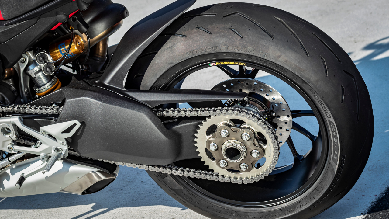 Στα φρένα βλέπουμε δίσκους διαμέτρου 330 χλστ. και τις ακτινικής τοποθέτησης μονομπλόκ δαγκάνες Brembo Stylema με τέσσερα πιστόνια έκαστη. Ο πίσω δίσκος των 245 χλστ. φέρει δαγκάνα δύο εμβόλων. Το σύστημα πέδησης αξιοποιεί την μονάδα IMU και προσαρμόζει τη λειτουργία του ρυθμιζόμενου ABS και υπό κλίση.