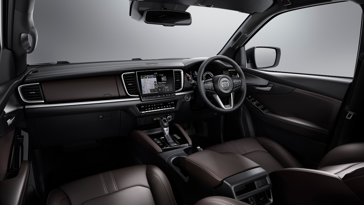 Εμφανής είναι και η προσοχή που έχει δοθεί στο εσωτερικό του νέου pick up των Ιαπώνων που θυμίζει περισσότερο από ποτέ επιβατικό μοντέλο, με την εικόνα να χαρακτηρίζεται μοντέρνα και σοβαρή. Όπως και τα υπόλοιπα Mazda έτσι και το BT-50 φέρει μια μεγάη οθόνη αφής στο κέντρο του ταμπλό για το σύστημα πολυμέσων του, το οποίο φαίνεται να είναι συμβατό με Apple CarPlay και Android Auto, παρέχοντας έτσι αυξημένες λύσεις συνδεσιμότητας.
