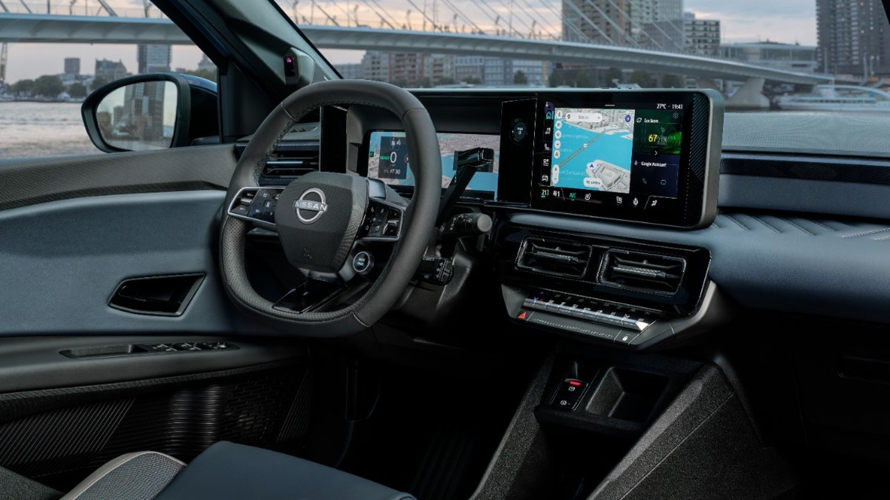 Στο εσωτερικό η θέση οδήγησης είναι χαμηλή και στο ταμπλό κυριαρχούν οι διπλές οθόνες των 10,1 ιντσών, ενώ τα μαλακά υλικά και ο ατμοσφαιρικός φωτισμός θέλουν να αναβαθμίσουν την οδηγική εμπειρία. Με ενσωματωμένες τις υπηρεσίες Google, οι εφαρμογές Google Maps, Assistant και Play Store είναι διαθέσιμες απευθείας από την κεντρική οθόνη, ενώ προσφέρεται και δυνατότητα φωνητικού ελέγχου με την πλοήγηση να παραμένει πάντα ακριβής και ενημερωμένη. Επίσης, με το NissanConnect, μπορείτε να ρυθμίσετε απομακρυσμένα τη θερμοκρασία καμπίνας και να ελέγξετε την κατάσταση φόρτισης της μπαταρίας, καθώς και να σχεδιάσετε τη διαδρομή σας με προγραμματισμένες στάσεις φόρτισης.