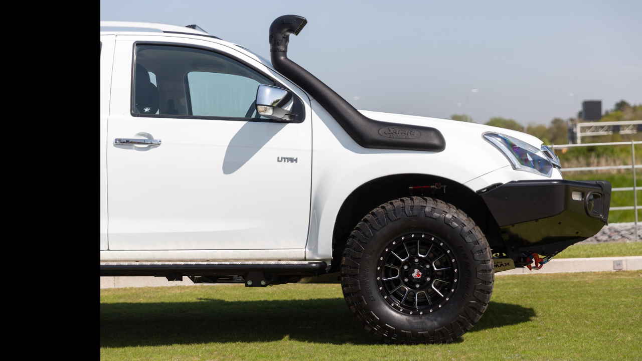Οι πιο ακραίες προσθήκες αφορούν το εμπρός μέρος με την τοποθέτηση έξτρα μεταλλικής μπάρας-προφυλακτήρα του καλύπτει σχεδόν ολόκληρο τον εργοστασιακό και προσφέρει… απαράμιλλη ηρεμία μυαλού όταν το D-Max χαράζει τον δικό του δρόμο εκεί που δεν υπάρχει.