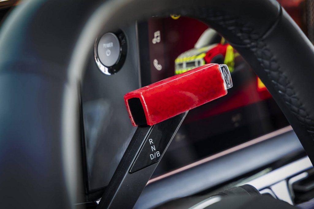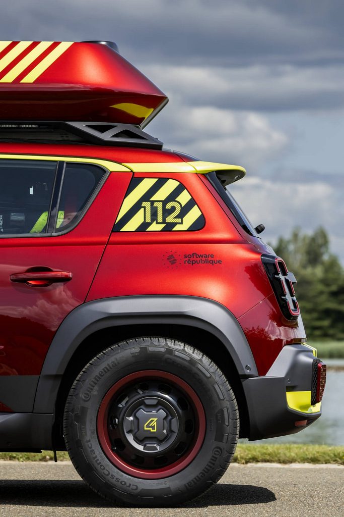 Το φωσφοριζέ κεντρικό τμήμα παραπέμπει αμέσως σε όχημα αμέσου επεμβάσεως, ενώ παράλληλα, αντικατοπτρίζει το σχεδιασμό του λογότυπου του Renault 4 E-Tech electric. Οι λέξεις “RESCUE” και “SAPEURS POMPIERS” (πυροσβεστική υπηρεσία), στα διαγώνια αυτοκόλλητα με τα μεγάλα γράμματα στα πλαϊνά πάνελ, ενώ οι αριθμοί έκτακτης ανάγκης 112 και 18, ξεχωρίζουν στα πίσω πλευρικά πάνελ.