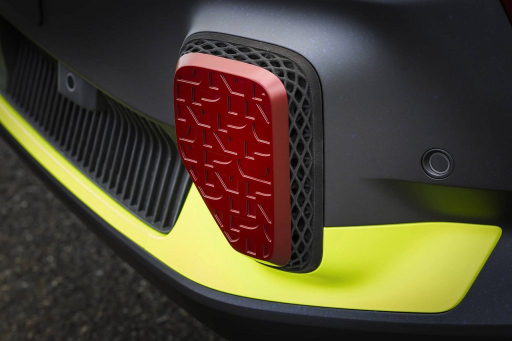 Στο μπροστινό και πίσω μέρος, οι προφυλακτήρες διαθέτουν ένθετα σε κίτρινη και κόκκινη απόχρωση, που δημιουργούν έντονη χρωματική αντίθεση. Δακτύλιοι ρυμούλκησης και πρόσθετα φώτα ολοκληρώνουν το πακέτο, δείχνοντας ότι το αυτοκίνητο είναι έτοιμο για σκληρή χρήση. Τα συμβατικά στοπ (‘πούλια’) στον μπροστινό και πίσω προφυλακτήρα, έχουν αντικατασταθεί από 3D εκτυπωμένα τμήματα με ιδιότητες απορρόφησης κραδασμών, και σε μοτίβο “PinPon”, μια αναφορά στον ήχο που κάνουν οι σειρήνες των οχημάτων έκτακτης ανάγκης στη Γαλλία.