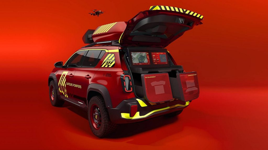 Το Vision 4rescue αξιοποιεί πλήρως την κατασκευαστική φιλοσοφία του Renault 4 E-Tech electric: το χαμηλό κατώφλι φόρτωσης και το επίπεδο, ορθογώνιο πορτμπαγκάζ διευκολύνουν την τοποθέτηση και την πλήρη εκμετάλλευση των αποθηκευτικών χώρων, ενώ η μεγάλη πίσω πόρτα παρέχει προστασία από τα στοιχεία της φύσης, σε όποιον εργάζεται στο κινητό κέντρο διοίκησης και συντονισμού.
