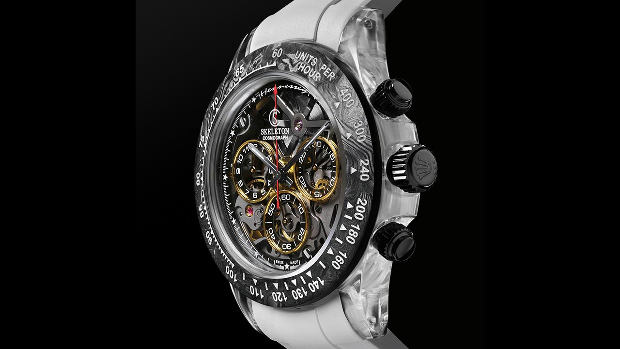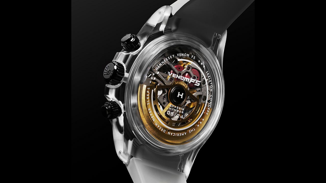 Αυτό που δημιούργησε η Hennessey είναι ένα σπάνιο Rolex, ειδική κατασκευή που θα συνοδεύει το Venom. Το απίστευτο σε αυτό το ακριβό δημιούργημα είναι η διάφανη κάσα και το καντράν του, που αποκαλύπτουν τον υπέροχο μηχανισμό του. Η κατασκευή του ήταν ιδιαίτερα πολύπλοκη και κράτησε για περισσότερες από 30 μέρες συνεχούς εργασίας σε τόρνο πέντε αξόνων εξαιρετικής ακρίβειας. Η απροσδόκητα μακρά διαδικασία κατεργασίας οφείλεται στην ασυνήθιστη επιλογή κρύσταλλου ζαφειριού.