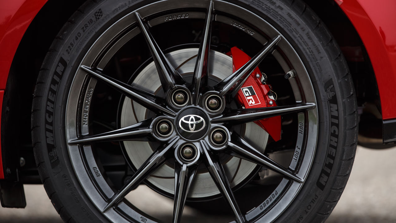 Το φρενάρισμα του Toyota GR Yaris αναλαμβάνουν δίσκοι 356 χλστ. εμπρός με τετραπίστονες αλουμινένιες δαγκάνες και πίσω δίσκοι 297 χλστ. με διπίστονες δαγκάνες. Για να τονίσει την αποτελεσματικότητα του συστήματος πέδησης η Toyota αναφέρει χαρακτηριστικά πως οι εμπρός δίσκοι έχουν μεγαλύτερη διάμετρο από εκείνους της GR Supra, ενώ ιδιαίτερη προσοχή έχει δοθεί και στην αίσθηση που δίνει το μεσαίο πεντάλ. Πιο στιβαρό και άμεσο είναι τέλος και το σύστημα διεύθυνσης με νέα αλουμινένια κολόνα για το τιμόνι αλλά και έγκαιρη ενεργοποίηση του συστήματος υποβοήθησης. Από άκρη σε άκρη οι στροφές του τιμονιού είναι 2,36. Οι ζάντες του είναι αλουμινίου, 18 ιντσών και φορούν ελαστικά 225/40.