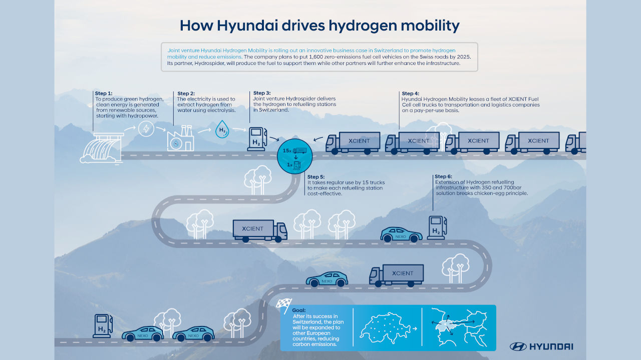 Η Hyundai δεν διάλεξε τυχαία την Ελβετία για να λειτουργήσει τα πρώτα υδρογονοκίνητα φορτηγά της επί ευρωπαϊκού εδάφους. Οι Κορεάτες πιστεύουν ότι το υδρογόνο που θα χρησιμοποιούν τα φορτηγά τους πρέπει να παράγεται από ανανεώσιμες πηγές ενέργειας και η Ελβετία συγκαταλέγεται ανάμεσα στις κορυφαίες της Γηραιάς Ηπείρου στην παραγωγή υδροηλεκτρικής ενέργειας. Ένας ακόμη λόγος είναι οι φοροαπαλλαγές στα βαρέα οχήματα μηδενικών ρύπων έναντι των συμβατικών με κινητήρες diesel.