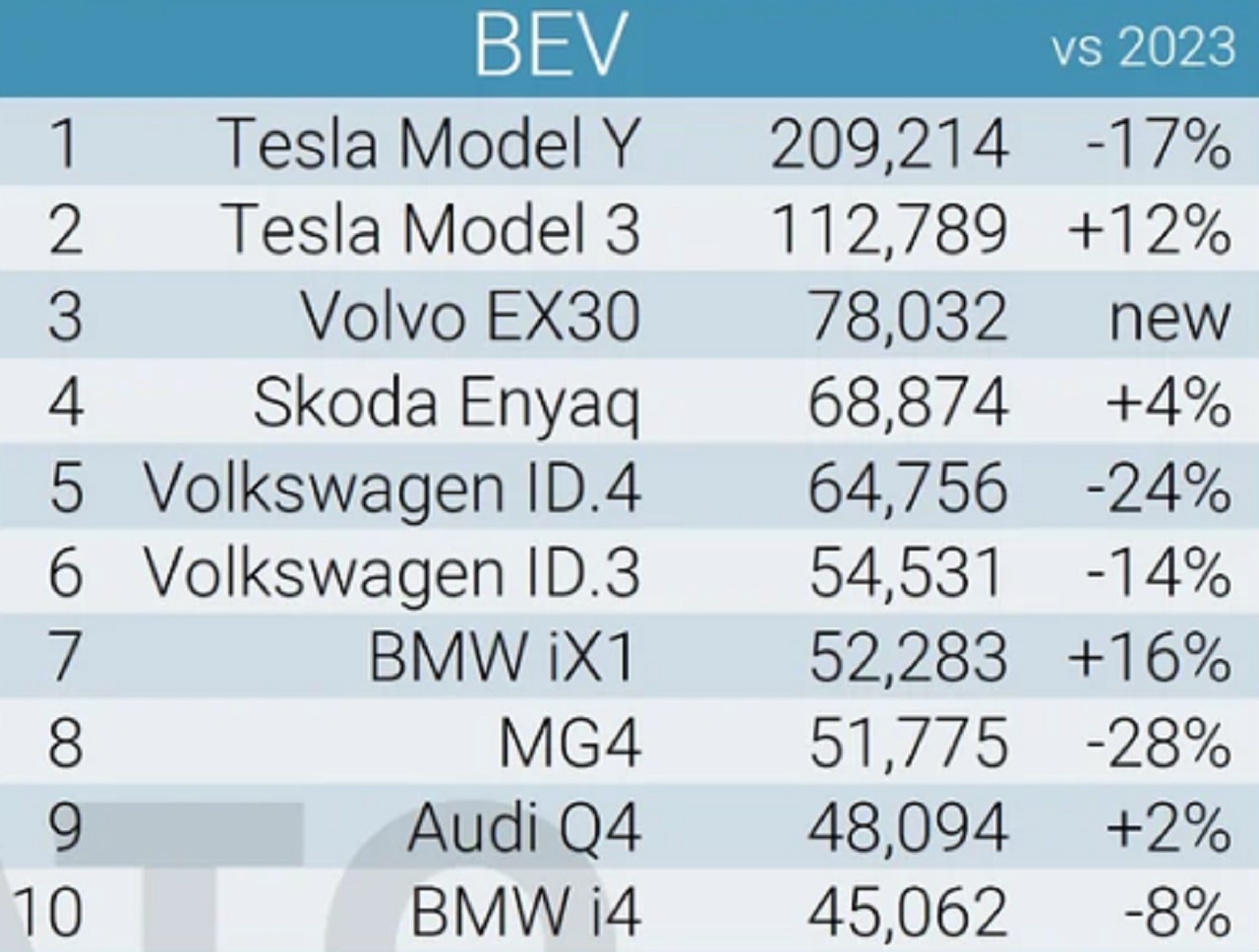 Πριν πάμε στο Top 10, αξίζει να αναφέρουμε ότι μόλις ένα κινέζικο μοντέλο κατάφερε να συμπεριληφθεί στις δέκα πρώτες θέσεις και αυτό είναι το MG4. Με 51.775 ταξινομήσεις βρέθηκε στην 8η θέση. Ακολουθεί ο σχετικός πίνακας με τα δημοφιλέστερα ηλεκτρικά στην Ευρώπη για το 2024.