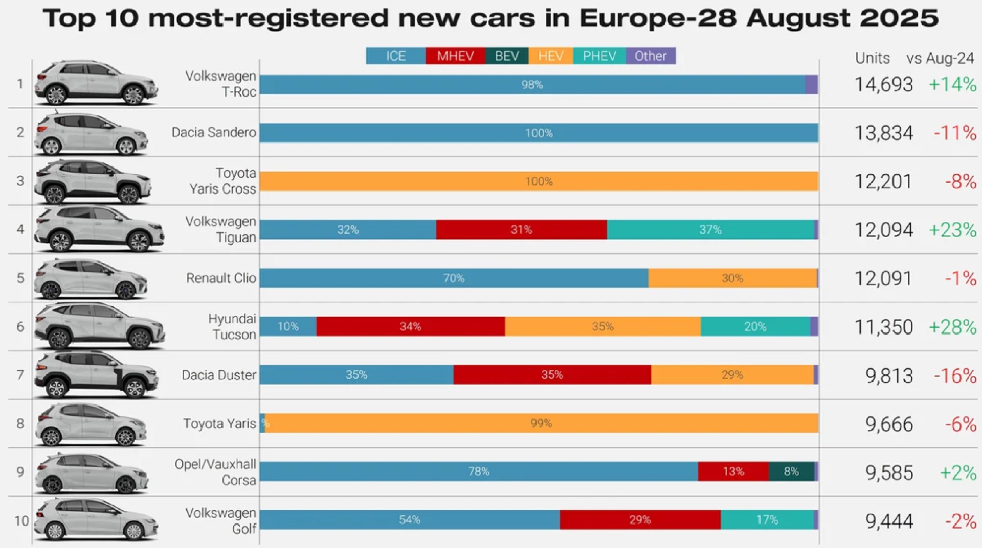 Οι ταξινομήσεις νέων μοντέλων για τον Αύγουστο του 2025 δημοσιεύθηκαν, με το VW T-Roc να είναι το best seller μοντέλο γι’ αυτόν τον μήνα. Αυτή τη φορά, θα δούμε αναλυτικά τι συνέβη στην πρώτη δεκάδα, ποιο μοντέλο κατέγραψε την μεγαλύτερη μείωση, αλλά και ποιο την μεγαλύτερη αύξηση συγκριτικά με τον ίδιο μήνα του 2024.