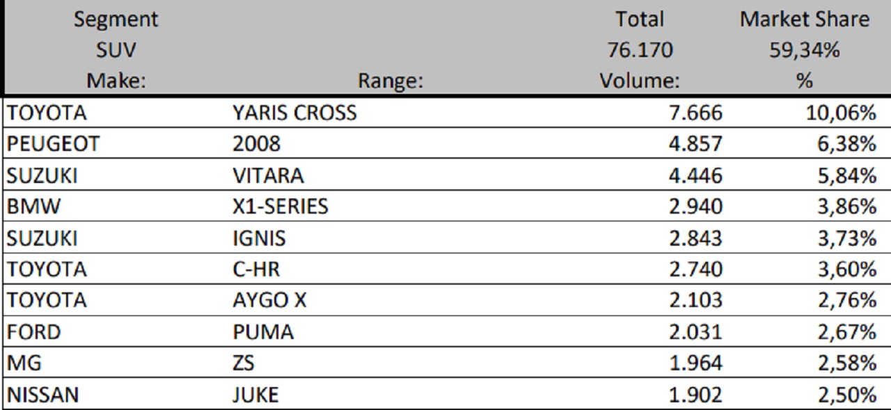 Στην κορυφή των SUV συναντάμε το Toyota Yaris Cross, το οποίο με 7.666 ταξινομήσεις έχει δημιουργήσει τόσο μεγάλη διαφορά που δεν υπάρχει περίπτωση να χάσει την πρωτιά μέχρι το τέλος της χρονιάς. Σειρά έχει το Peugeot 2008, το οποίο ταξινομήθηκε 4.857 φορές και η πρώτη τριάδα ολοκληρώνεται με το Suzuki Vitara των 4.857 ταξινομήσεων μέσα σε διάστημα 11 μηνών.