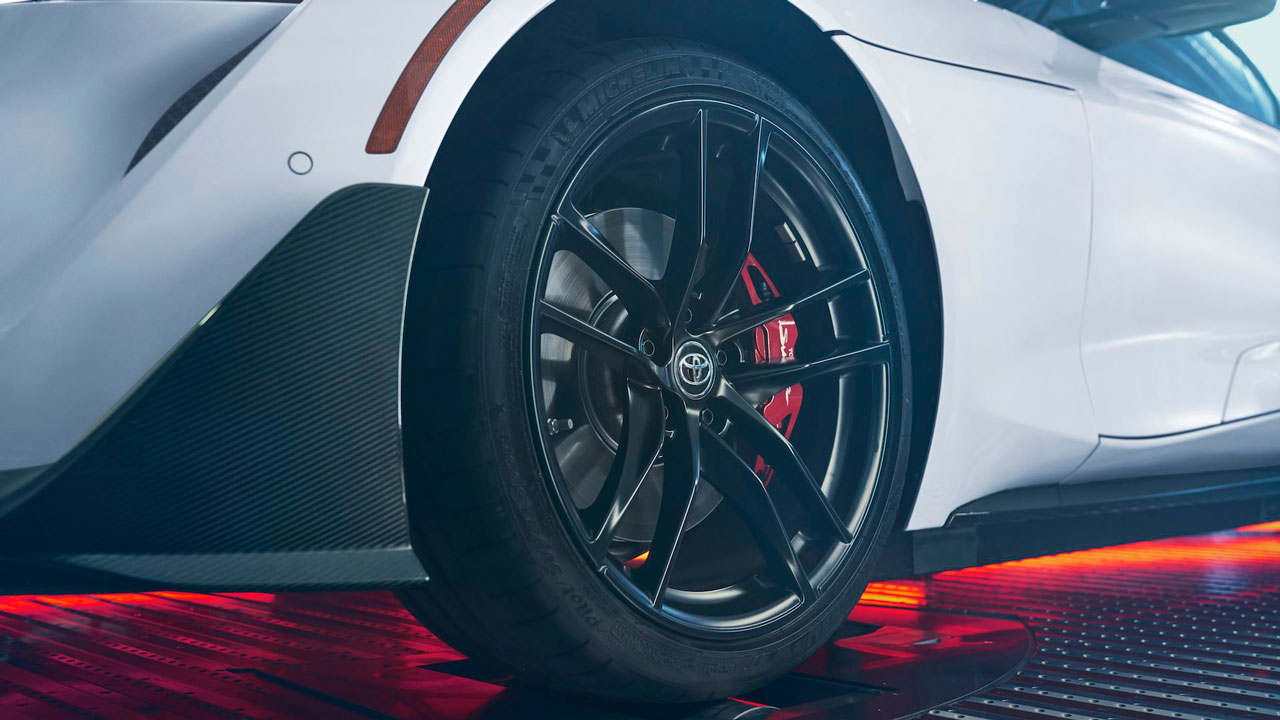 Οι αλλαγές στην εξωτερική εμφάνιση ολοκληρώνονται με του τροχούς μεγέθους 19 ιντσών, οι οποίοι «φιλοξενούν» φρένα της Brembo με κόκκινες δαγκάνες. Σημαντικές διαφοροποιήσεις υπάρχουν και στο εσωτερικό της νέας Toyota GR Supra A91-CF, όπου επικρατούν οι κόκκινες και μαύρες επενδύσεις τύπου alcantara. Επιπλέον αξιοσημείωτα στοιχεία είναι οι carbon επενδύσεις, τα αλουμινένια πεντάλ, αλλά και πλούσιος εξοπλισμός.