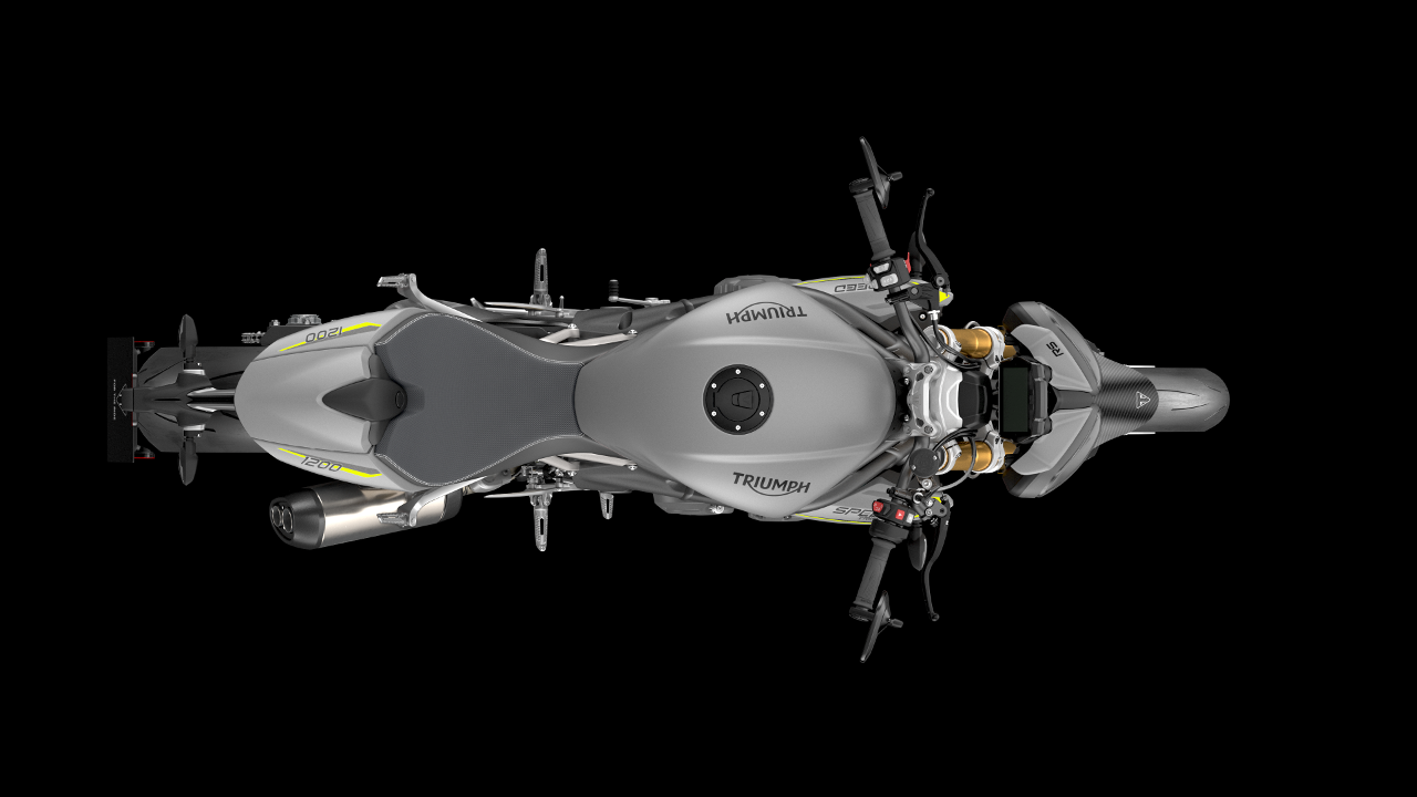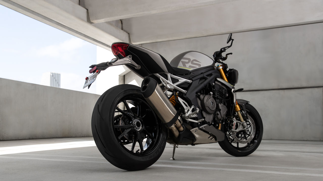Ως πρώτη έκδοση η Triumph μας πηγαίνει κατευθείαν στην κορυφή και μας παρουσιάζει την RS, η οποία φέρει πλήρως ρυθμιζόμενες αναρτήσεις εμπρός και πίσω από την Ohlins (πιρούνι NIX30 και αμορτισέρ TTX36), ενώ στον τομέα των φρένων μπροστά βλέπουμε δίσκους διαμέτρου 320 χλστ. και τις μονομπλόκ ακτινικά τοποθετημένες 4πίστονες Stylema δαγκάνες της Brembo. Από την ιταλική εταιρία προέρχεται και η διπίστονη δαγκάνα του πίσω δίσκου.