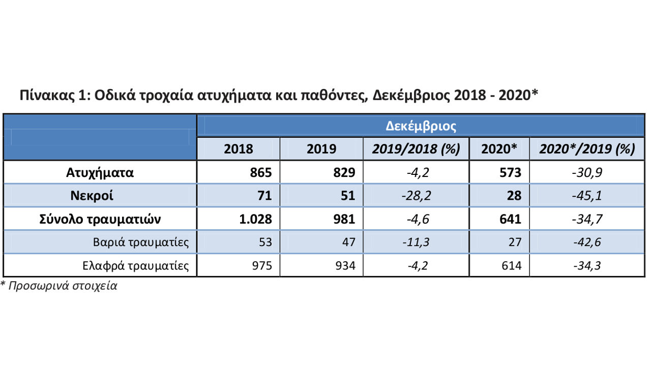Σε σύνολο έτους για το 2020, τα προσωρινά στοιχεία δείχνουν μείωση των τροχαίων ατυχημάτων κατά -15% σε σχέση με το 12μηνο του 2019, αλλά και μείωση νεκρών κατά 15,8%. Αξιοπρόσεκτη είναι επίσης η μείωση στους βαριά τραυματίες μεταξύ 2020 και 2019 με 487 έναντι 652 και μείωση που έφτασε στο 25,3%. Μείωση της τάξης του 18% είχαμε και για τους ελαφριά τραυματίες που έφτασαν το 2020 στους 10.130 έναντι 12.350 το 2019.