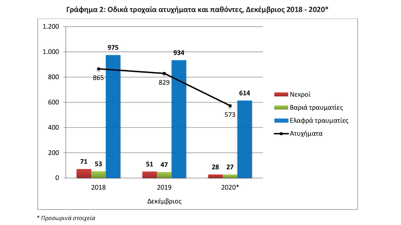 Από τα παθόντα πρόσωπα των τροχαίων ατυχημάτων, καταγράφηκαν 28 νεκροί, 27 βαριά τραυματίες και 614 ελαφρά τραυματίες, έναντι 51 νεκρών, 47 βαριά τραυματιών και 934 ελαφρά τραυματιών τον Δεκέμβριο του 2019, παρουσιάζοντας μείωση κατά 45,1% σε νεκρούς, κατά 42,6% σε βαριά τραυματίες και κατά 34,3% σε ελαφρά τραυματίες.