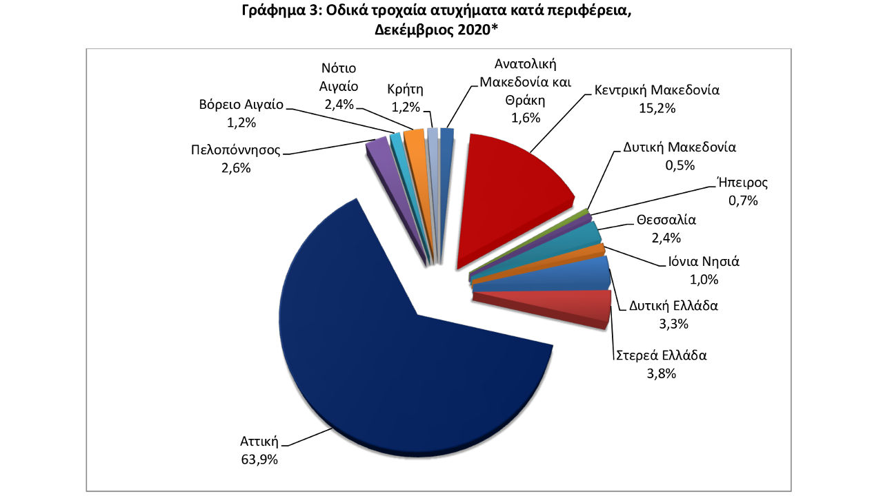 Κατά περιφέρεια, η Αττική, βρίσκεται ξανά πρώτη σε συνολικό αριθμό τροχαίων συγκεντρώνοντας σε ποσοστό το 63,9%. Στη δεύτερη θέση ακολουθεί η Κεντρική Μακεδονία με 15,2% με τρίτη τη Στερεά Ελλάδα με 3,8% και τέταρτη τη Δυτική Ελλάδα με 3,3% (Δείτε αναλυτικά την πίτα στη gallery).