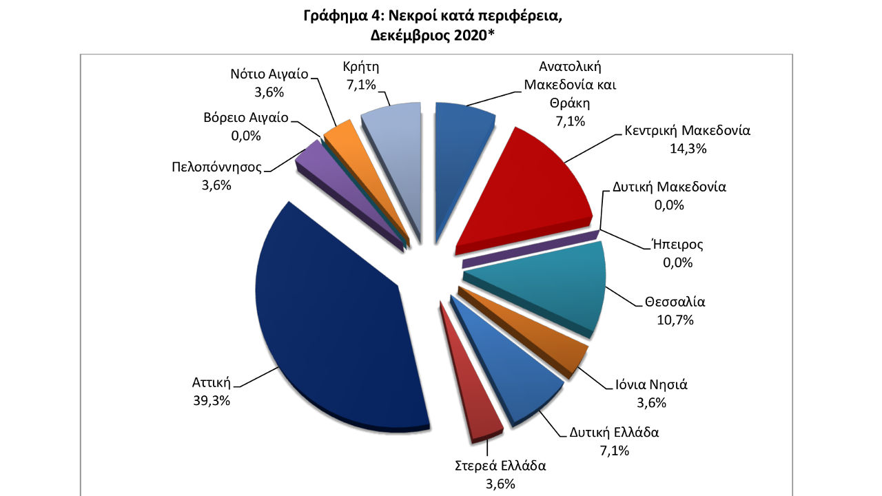H Αττική συγκεντρώνει παράλληλα και το μεγαλύτερο ποσοστό των νεκρών με 39,3%, με την Κεντρική Μακεδονία να ακολουθεί με 14,7% και τη Θεσσαλία στην τρίτη θέση με 10,7%. Από την άλλη πιο αισιόδοξη μεριά, μηδενικό ποσοστό σε νεκρούς για τον Δεκέμβριο έχουμε για την Ήπειρο, τη Δ. Μακεδονία και το Β. Αιγαίο.