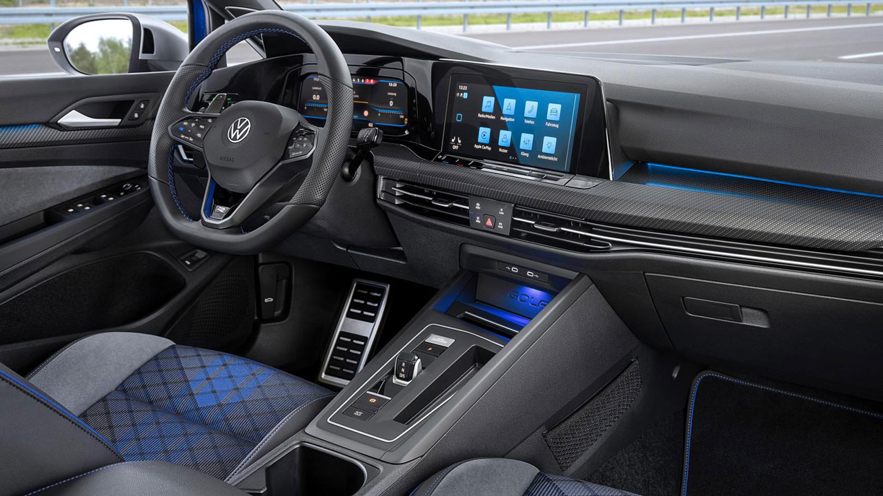 Παρόμοιο σκηνικό επικρατεί και στο εσωτερικό του VW Golf R Estate, όπου συναντάμε αρκετές διαφορές συγκριτικά με τις απλές εκδόσεις. Μερικές εξ’ αυτών είναι τα σπορ καθίσματα, το διαφοροποιημένο τιμόνι που φέρει κουμπί σπορ για την άμεση αλλαγή στο πρόγραμμα «Race» και τα αλουμινένια πεντάλ. Στην προκειμένη περίπτωση, βέβαια, υπάρχουν σημαντικές αλλαγές και σε επίπεδο χώρων, αφού στην καμπίνα υπάρχει υπάρχει μία διεύρυνση για τα πόδια των πίσω επιβατών κατά περίπου 40 χλστ. συγκριτικά με την hatchback έκδοση. Εννοείται ότι το «δυνατό χαρτί» του VW Golf R Estate είναι οι χώροι για τις αποσκευές, όπου τα 611 λίτρα μπορούν να εκτοξευθούν σε 1.642 με τα καθίσματα αναδιπλωμένα.