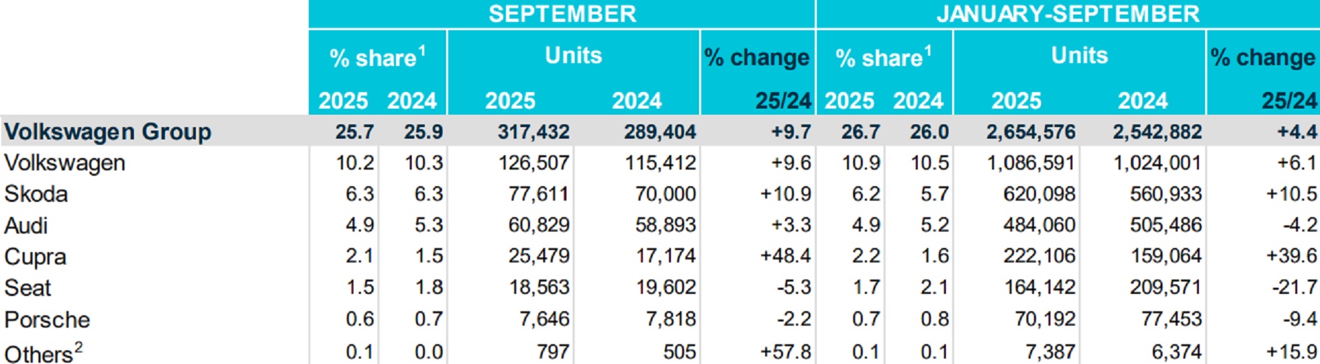 Όπως θα δείτε και στον σχετικό πίνακα, η CUPRA κατάφερε μέσα στο 9μηνο να καταγράψει μία αύξηση της τάξης του 39,6% συγκριτικά με το ίδιο διάστημα πέρυσι. Πρόκειται για την μεγαλύτερη ποσοστιαία αύξηση με διαφορά από τις υπόλοιπες εταιρείες. Θετικό πρόσημο καταγράφουν επίσης οι Skoda και Volkswagen με ποσοστά 10,5% και 6,1%. Ακολουθεί πίνακας όπου θα δείτε αναλυτικά τις ταξινομήσεις του VW Group στην Ευρώπη.