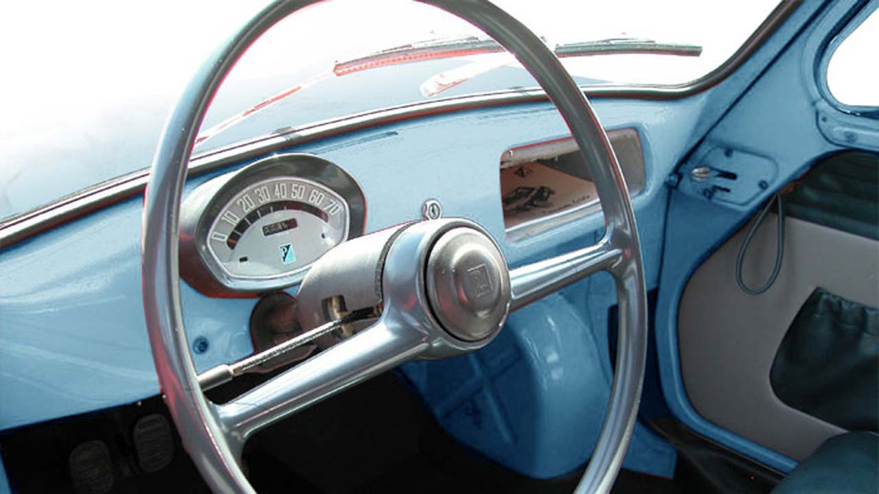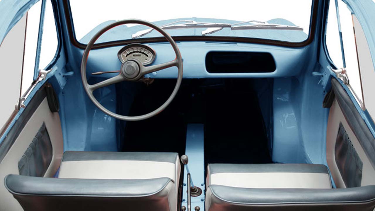 Το αυτοκίνητο ήταν κατά κύριο λόγο διθέσιο, με έναν μικρό χώρο πίσω από τα καθίσματα είτε για τη φιλοξενία δύο μικρών παιδιών, είτε για αποσκευές. Οι πόρτες του άνοιγαν αντίστροφα από το συνηθισμένο ώστε να παρέχουν ευκολότερη πρόσβαση στο εσωτερικό του. Το ταμπλό του αυτοκινήτου ήταν υπέρ του δέοντος μινιμαλιστικό, καθώς διέθετε μόνο ένα ταχύμετρο πίσω από το διάκτινο τιμόνι και έναν διακόπτη για τα φλας και τα φώτα. Υπήρχε ακόμη ένας μηχανικός διακόπτης στο μέσον του ταμπλό, ο οποίος ανοιγόκλεινε ένα κλαπέτο, μέσω του οποίου ο αέρας που έμπαινε στην καμπίνα προερχόταν είτε από τον κινητήρα για θέρμανση, είτε απ’ έξω για ψύξη. Στο πάτωμα ανάμεσα στα δύο καθίσματα υπήρχε ο λεβιές ταχυτήτων, το χειρόφρενο και εκατέρωθεν αυτού το τσοκ και ο διακόπτης εκκίνησης. Όσον αφορά τη ρεζέρβα, βρισκόταν τοποθετημένη στο πάτωμα κάτω απ’ το κάθισμα του συνοδηγού.